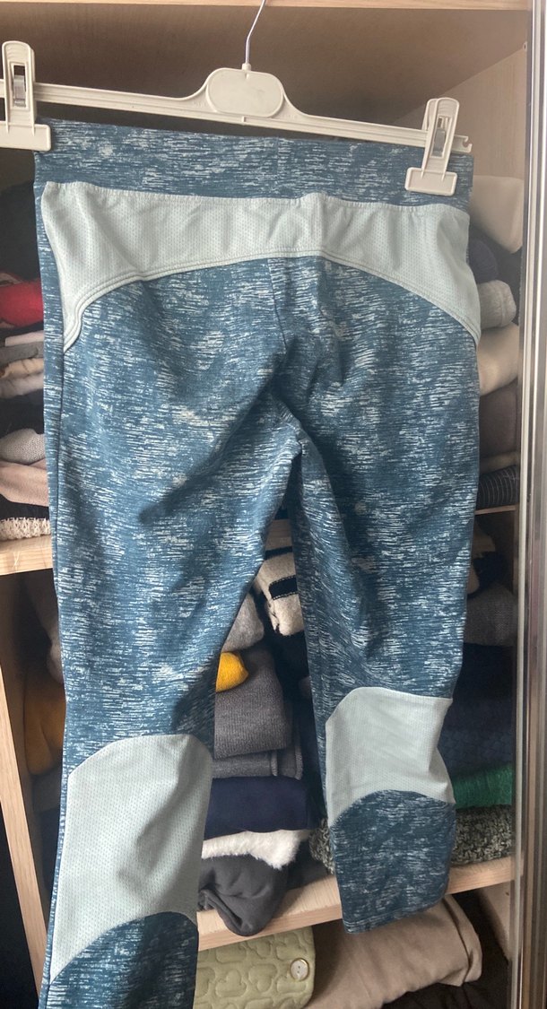 Kadınlar için mavi denim görünümlü, gri velcro detaylı, diz altı spor tayt. Şehir stili ve sportif kombinlere uygundur. ♀️uzun boy değildir