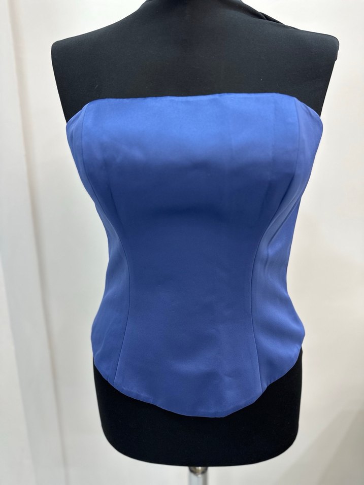 Drapeli ve straplez tasarımlı, koyu mavi renkli, sentetik kumaştan yapılmış, modern kesim. İade ve değişim yoktur. ✨ 36-38 uyumludur.