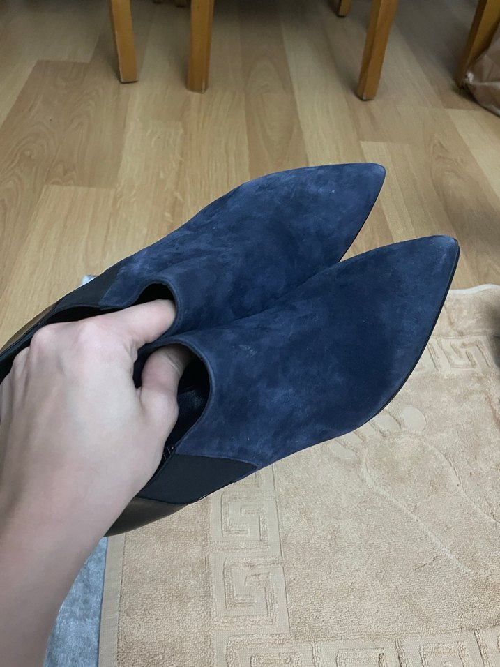Koyu mavi süet kadın botları, dolgu topuklu ve tokalı detaylıdır. Minimalist ve çağdaş tarzda, günlük kullanım için uygundur.