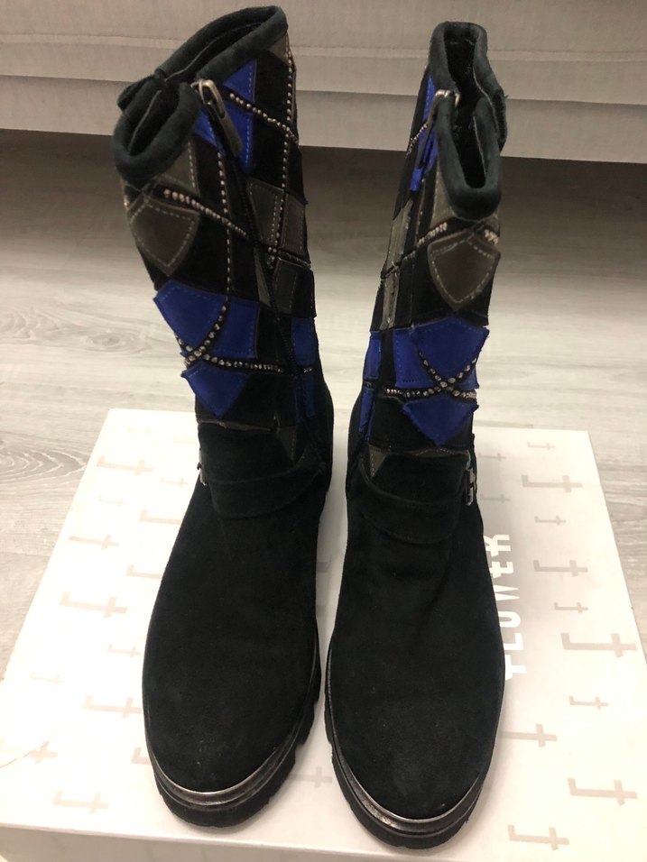Kadınlar için koyu mavi süet, desenli ve tokalı kayışlara sahip botlar. Platform topuklu, cesur ve avangart tarz için uygun. Günlük kullanım numaraiçin ideal. 37 numara