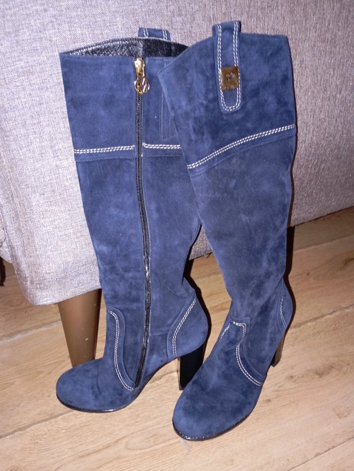 Mavi süet diz boyu, yüksek topuklu, tokalı çizme. Rahat ve bohem tarzıyla günlük kullanıma uygun şık bir model.