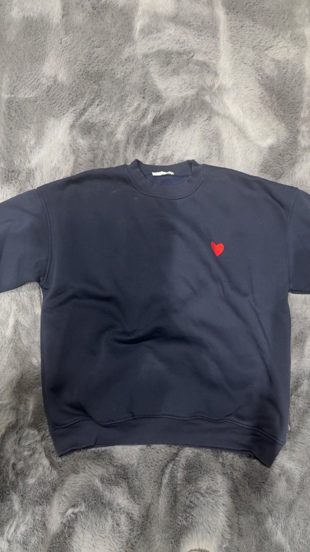 Kadın sweatshirt, bisiklet yaka ve uzun kollu, rahat kesimdir. Yumuşak ve sıcak kumaştan, koyu mavi renkte küçük kırmızı kalp baskılıdır.