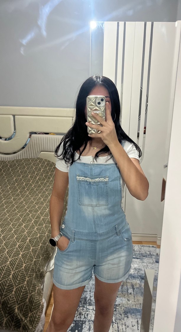 Mavi pastel tonlarda tie-dye desenli, kısa kollu, straplez kesim ve fitted kalıplı denim şort tulum, rahat ve şık sokak stili sunar.