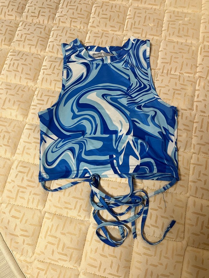 Koyu mavi tonlarda tie-dye desenli, kolsuz ve fitted kesim mini üst. Kısa boyunda bağcık detayı bulunur, sokak modası ve athleisure tarzına uygundur.