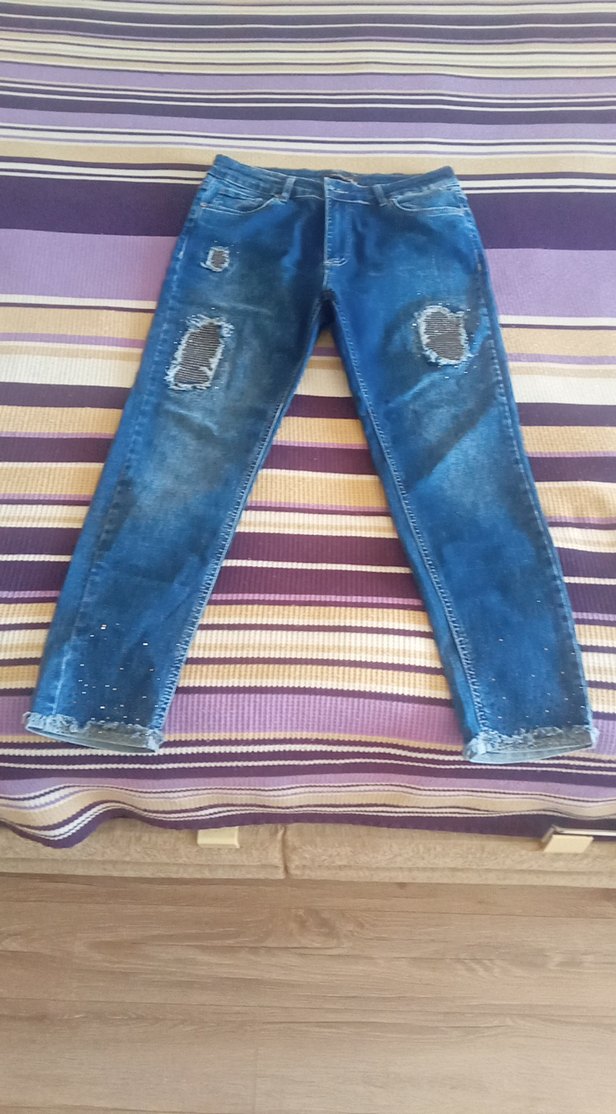 Kadınlar için mavi denim kot pantolon, regular fit ve midi boy, parlak tie-dye desenli ve tokalı detaylara sahip. Günlük kullanıma uygun. çok kaliteli ve likralı ,dar paça sevmediğim için satıyorum