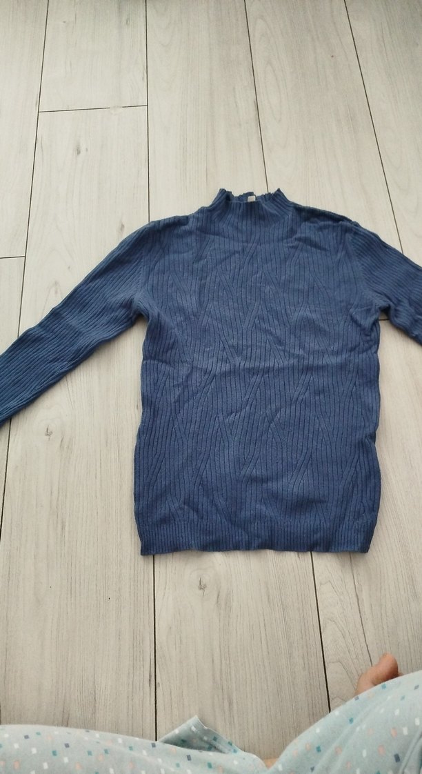 Mavi renkte, triko dokulu, balıkçı yaka ve uzun kollu, ince kesim kadın kazağı. Rahat ve günlük kullanıma uygun.