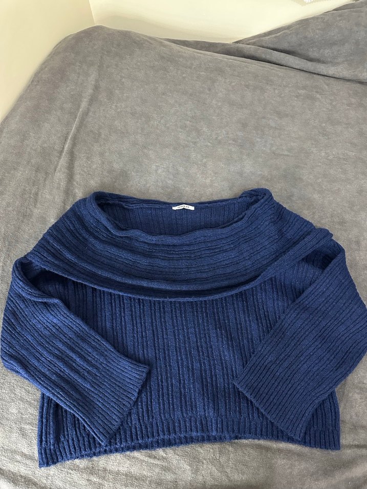 Kadınlar için kayık yaka, uzun kollu, bol kesim mavi triko kazak. Yumuşak örme kumaştan, düz ve desensiz tasarım. Normal midi uzunlukta, günlük kullanıma uygun.
