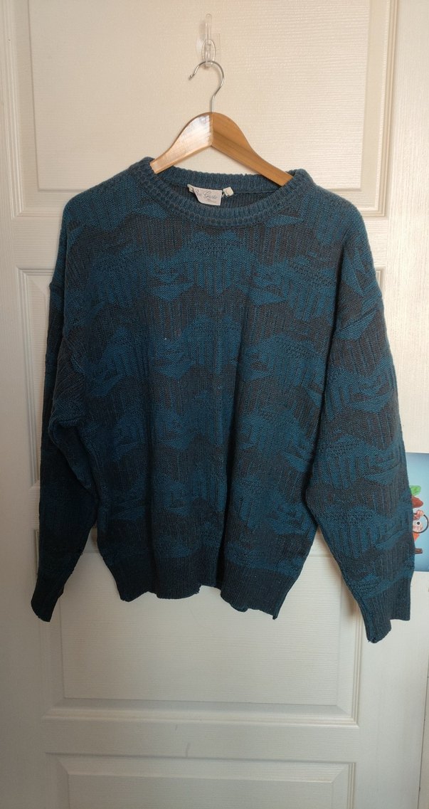 Kadınlar için triko, bol kesim, uzun kollu ve yuvarlak yakalı. Yumuşak örgü kumaştan, koyu mavi tonlarda desenli. Trendy günlük stil için uygundur. ortasında küçük bir delik var vintage