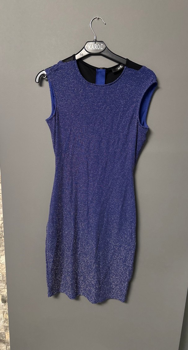 Kolsuz, triko kumaştan yapılmış, mavi renkli, midi boy ve dar kesim elbise. Minimalist tarzda, günlük kullanıma uygun.