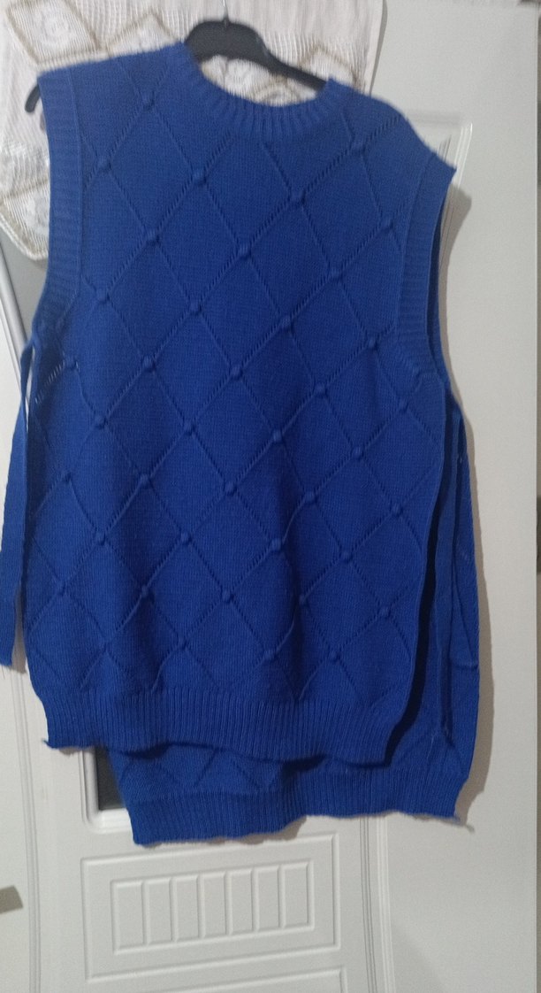 Kadınlar için mavi triko süveter, bisiklet yaka ve kolsuz tasarıma sahip. Normal midi boy, rahat kesim ve örgü dokusu ile günlük kullanıma uygundur. standart beden oversize tarz fiyatı da uygundur