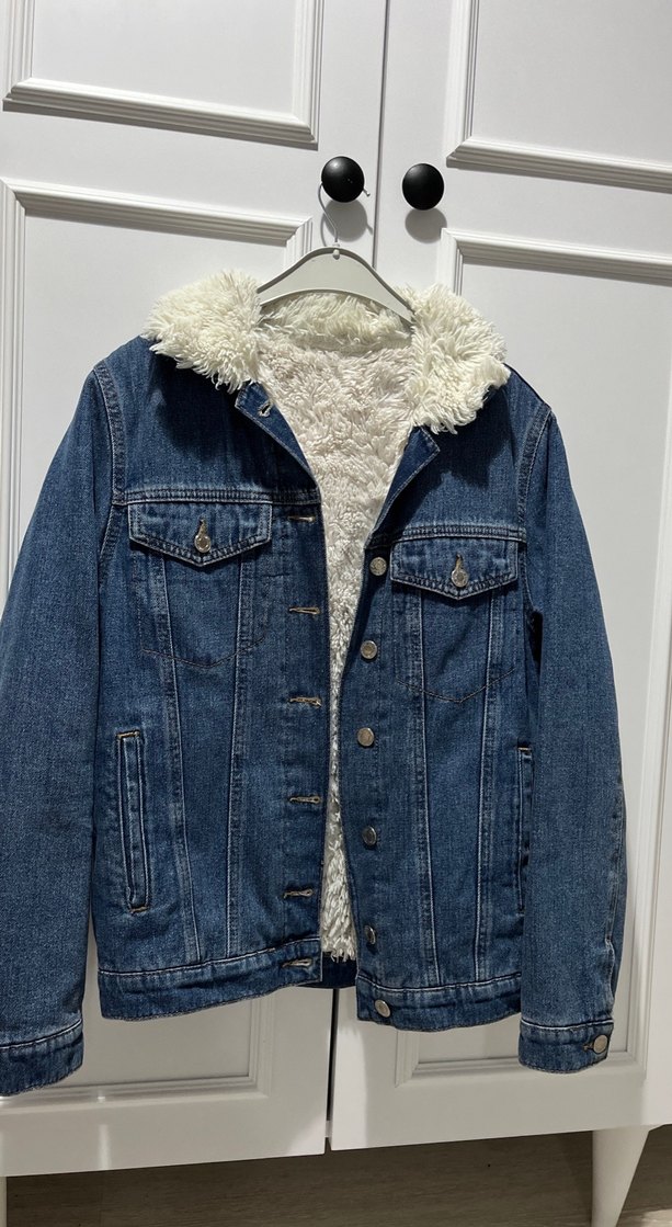 Mavi denim kumaştan, içi ve yakası tüylü detaylı,uzun kollu ve kesimli yaka tasarımlı rahat sokak stili ceket. Günlük kullanıma uygun.