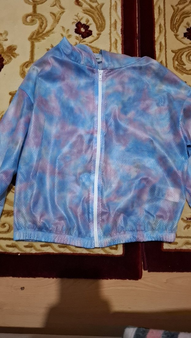 Kadınlar için bol kesim, pastel mavi batik desenli, uzun kollu, fermuarlı ve kapüşonlu yağmurluk. Yumuşak sentetik kumaştan, günlük rahat stil ve athleisure için uygundur.