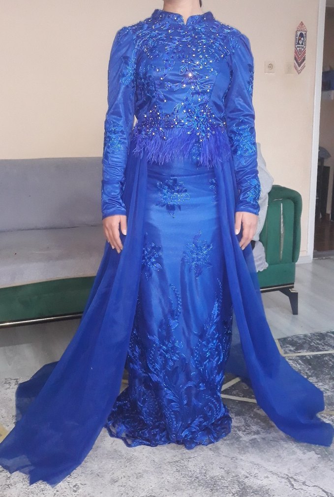 Mavi uzun abiye elbise, yüksek yakalı ve uzun kollu. Drapeli ve desenli detaylarıyla klasik şıklık sunar, düğün ve özel günler için uygundur. ✨hiç kullanılmadı 2 adet 36 bulunmakta adeti 900