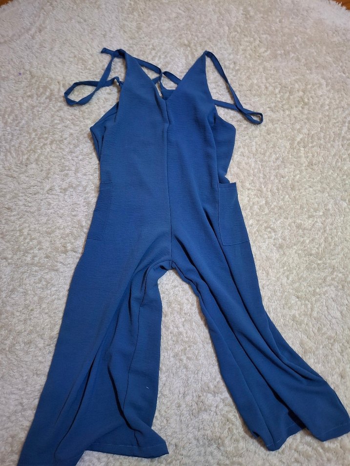 Kadın mavi tulum, askısız yakalı ve ince askılı, bol kesimdir. Yumuşak ve sıcak kumaştan, uzun boyda ve desensizdir. Günlük kullanıma uygun, rahat ve şık bir modeldir.