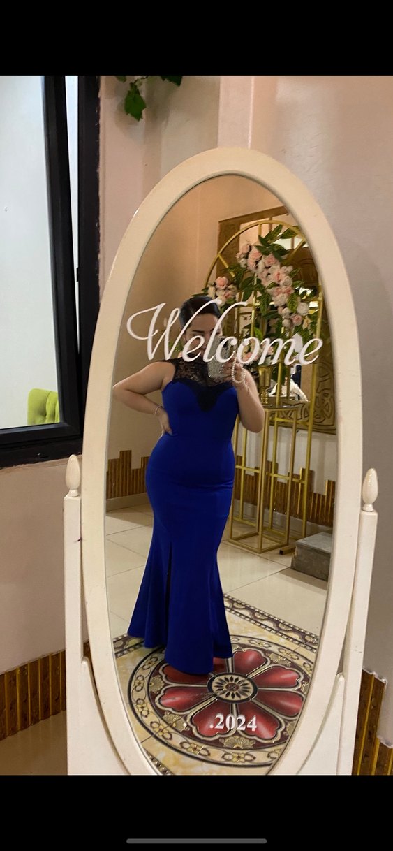 Bu dar kesim uzun abiye elbise, straplez yaka ve kolsuz tasarıma sahip, parlak mavi kumaş ve dantel detaylarıyla düğünler için uygundur.