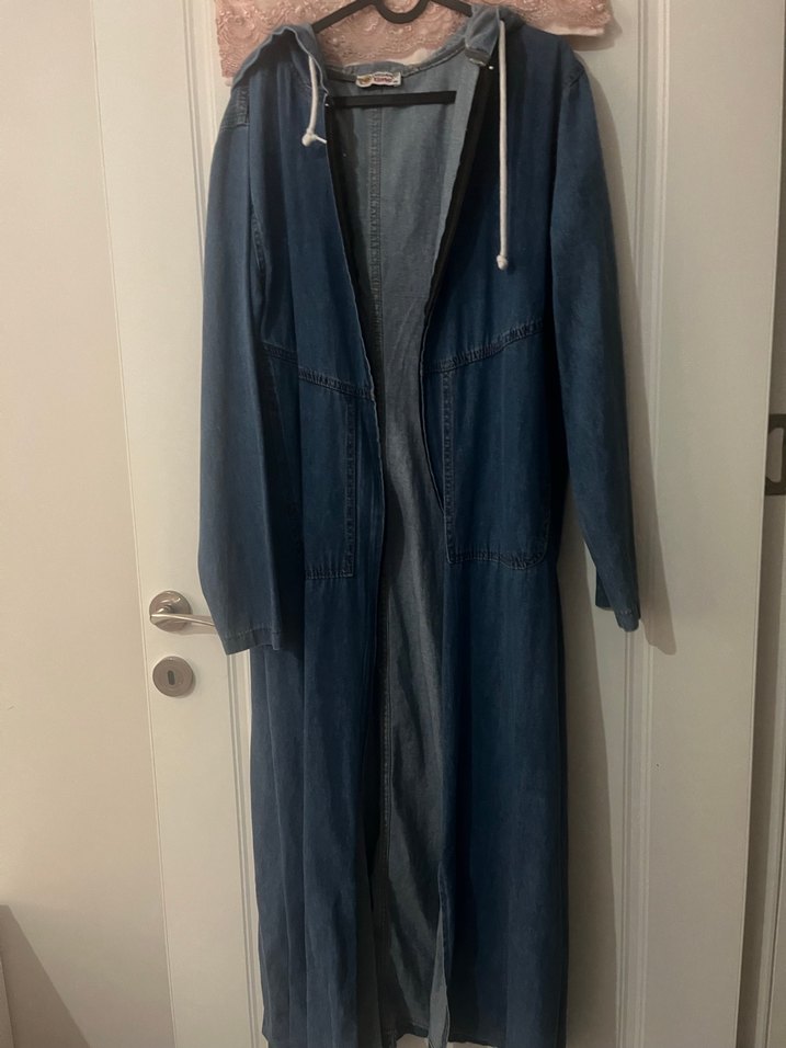 Kadınlar için uzun, bol kesim mavi denim ceket. Dökümlü tasarıma ve kesik yaka detayına sahip, günlük rahat kullanıma uygundur.