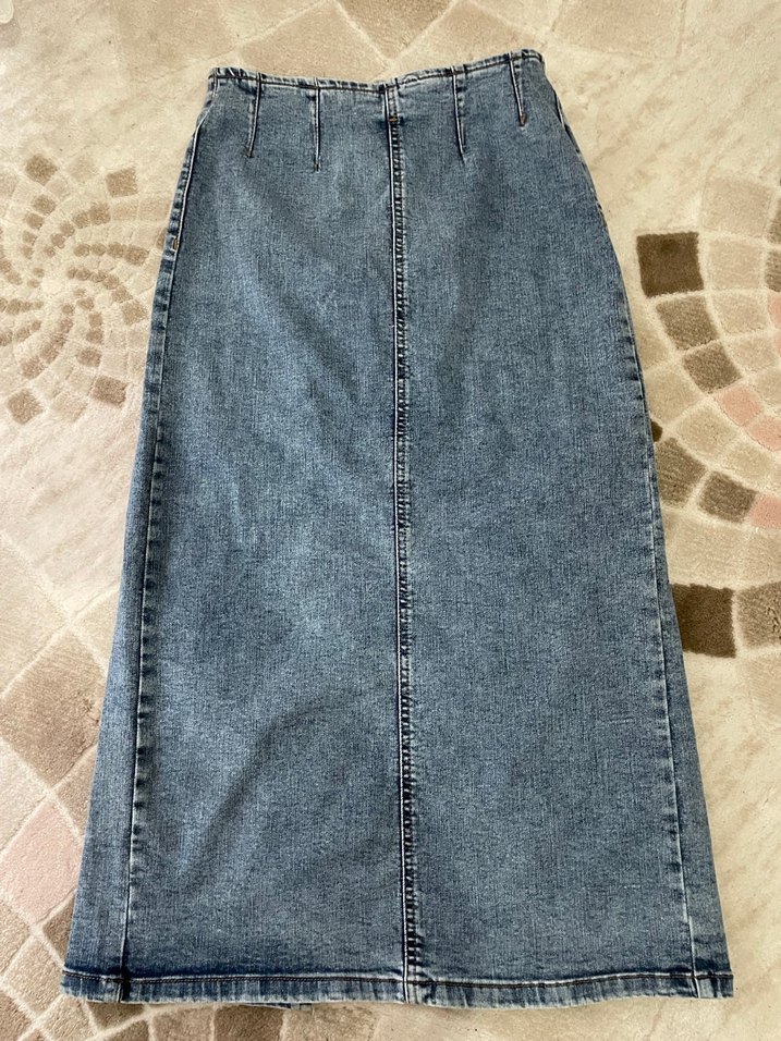 Bu kadın uzun denim etek, mavi renkte, rahat kesim ve sade, zahmetsiz şıklık sunar. Günlük kullanıma uygun bohem tarzda.
