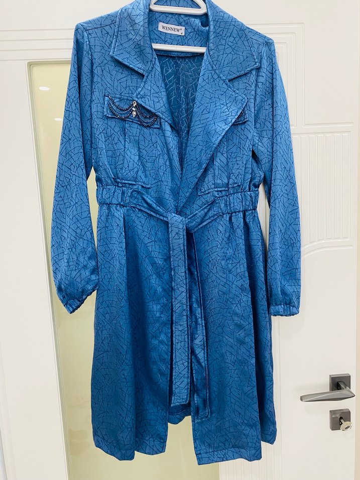 Uzun mavi denim ceket, kemerli ve kesimli yakalıdır. Parlak batik desenli, uzun kollu ve rahat kesimdir. Günlük kullanım için uygundur.