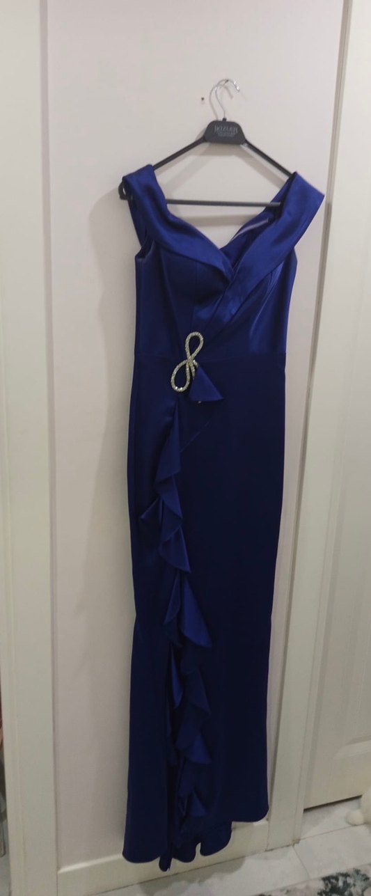 kadın abiye elbise, parlak mavi kumaş, drapeli tasarım ve ince askılı. V yaka ve klasik modern stilde, düğünler için uygundur. Ürün 1 kez giyildi. Dolabım da yerim olmadığı için satıyorum hiç bir defosu veya hasarı yoktur isterseniz mesaj dan daha detaylı resim gönderilecektir