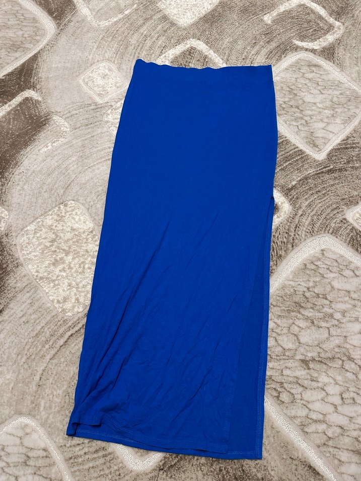 Koyu mavi renkte, drapeli ve vücuda oturan kesime sahip, sentetik kumaştan uzun kadın eteği. Günlük sokak stiline uygun.