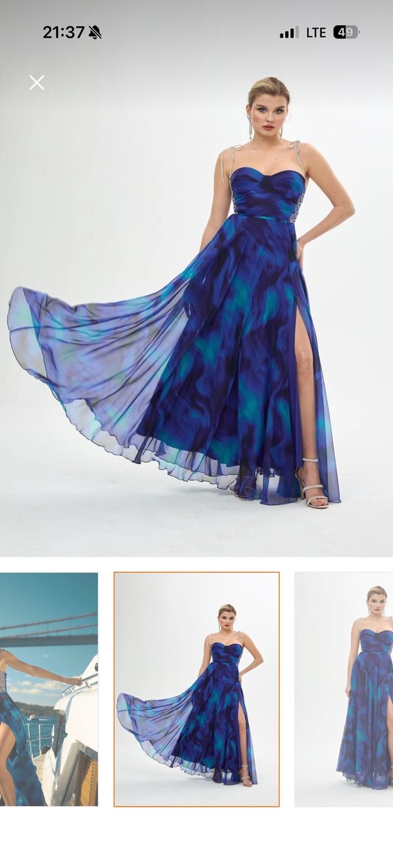 Uzun mavi abiye elbise, straplez yaka ve ince askılarla, sıkı kesim ve drapeli batik desenle tasarlanmıştır. Parti için modern ve göz alıcı bir seçim.