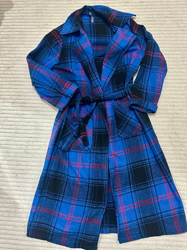 regular fit mavi ekose desenli ceket. Kemerli ve rahat