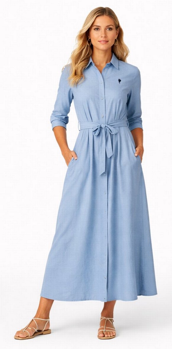 Kadınlar için uzun, kot kumaştan, uzun kollu ve kayık yaka elbise. Belden kemerli, rahat kesim ve pastel mavi renkte, ofis için uygun bohem tarzda.