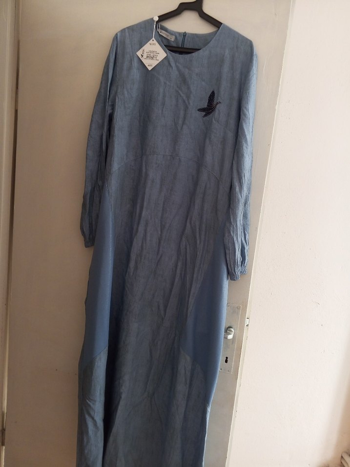 Keten kumaştan, uzun kollu, bol kesim mavi elbise. Yuvarlak yakalı, drapeli ve göğüste kuş işlemeli, günlük kullanıma uygun. 1875 TL'ye aldım ama hiç kullanmadım