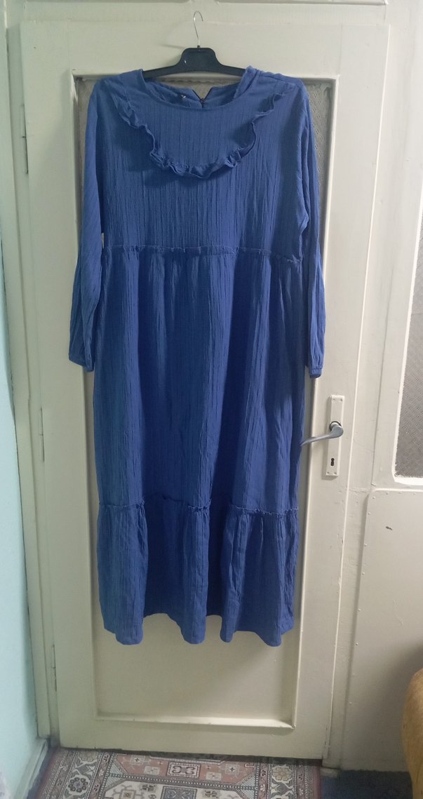Koyu mavi keten kumaştan, bol kesim, uzun kollu, fırfırlı detaylı, minimalist bohem tarzda uzun elbise İki kol arası: 55 cm Elbise Boyu: 132 cm Kol Boyu. : 58 cm Ürünü satın alarak DMD kas hastası Turan Ünal'ın tedavisine katkı sağlamış olacaksınız...(33)