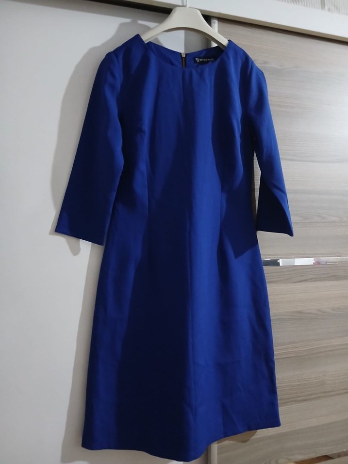Kadınlar için uzun, mavi renkte, yuvarlak yaka ve uzun kollu, drapeli detaylı elbise. Düzenli kesim ve parlak yüzeye sahip, ofis için modern klasik tarzda uygun.