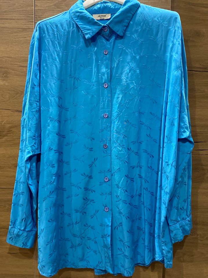 Saten uzun kollu, yakalı ve düğmeli gömlek. Parlak ipeksi kumaştan, mavi batik desenli, bol ve uzun kesim. Vintage sokak stili için uygun.