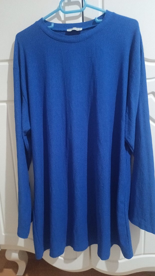 Kadınlar için uzun kollu, yuvarlak yakalı ve bol kesim keten kumaştan yapılmış koyu mavi midi boy tunik. takim Rahat ve sade tarz sunar. iki kol arası 59 cm uzunluk 80 cm dir