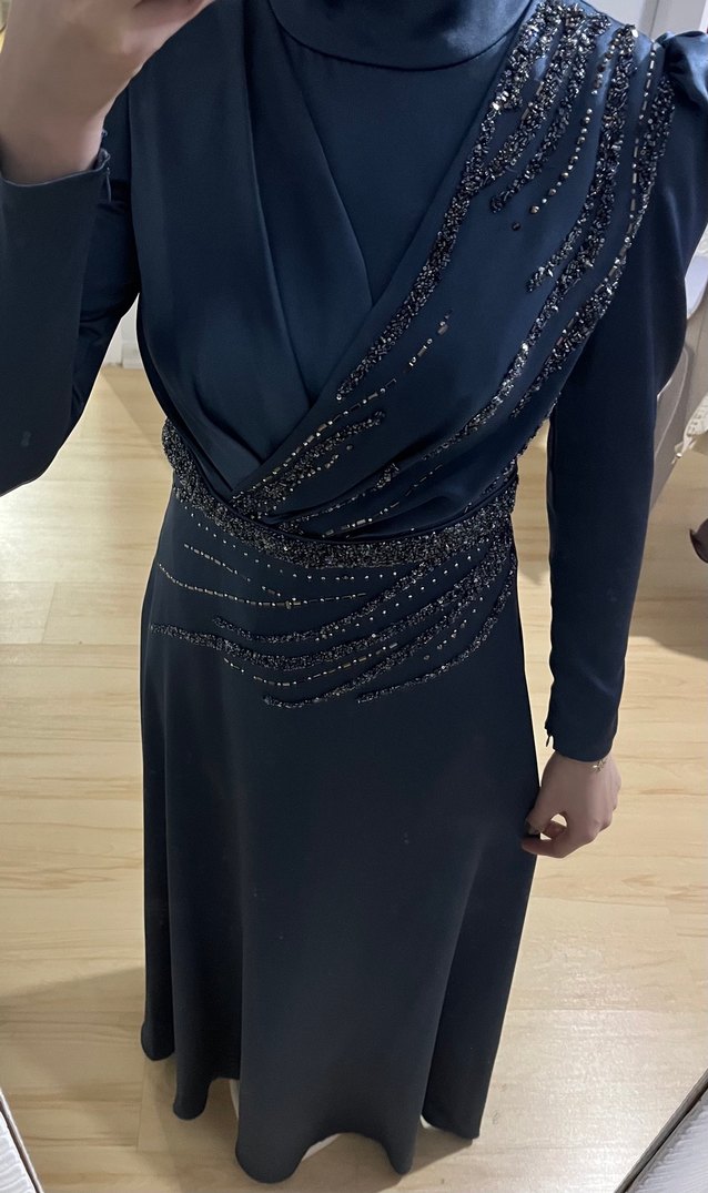 Mavi uzun kollu bu abiye elbise, nakışlı detayları ve drapeli tasarımıyla düğünler için uygundur.1 kere giyildi