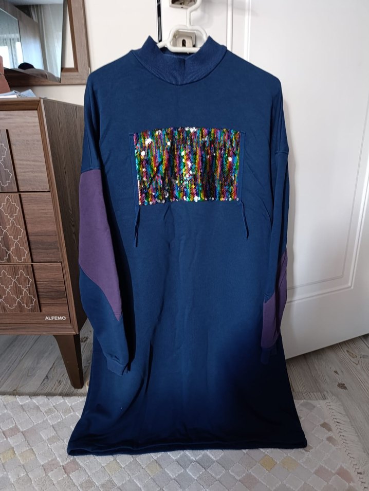 Kadınlar için uzun kollu, bol kesim ve yuvarlak yaka sweatshirttir. Koyu mavi renk, kollarda mor detaylar ve ön kısmında renkli payetli desen bulunur. ✨ Özel tasarımdır. Kışlıktır. 40 bedene uyumludur