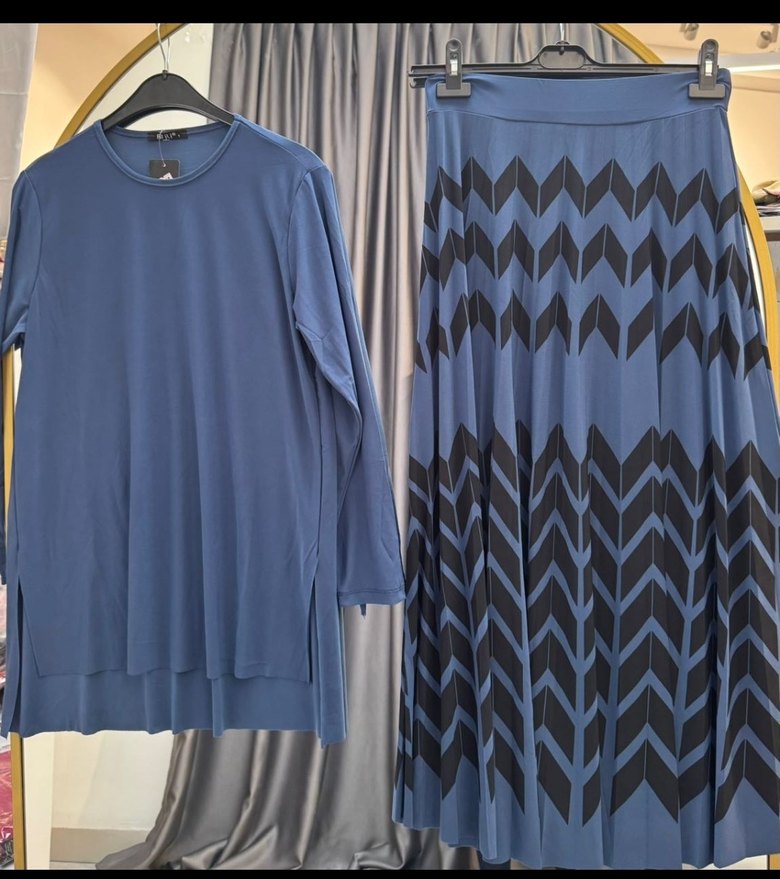 sıfır etiketli ürün iki takım var elimde 1 beden mavi olan ölçüleri iki kol arası 51 sm etek boyu 97 sm etek beli lastikli 38 sm tunigin önü 65 sm arkası 75 sm üzerinde