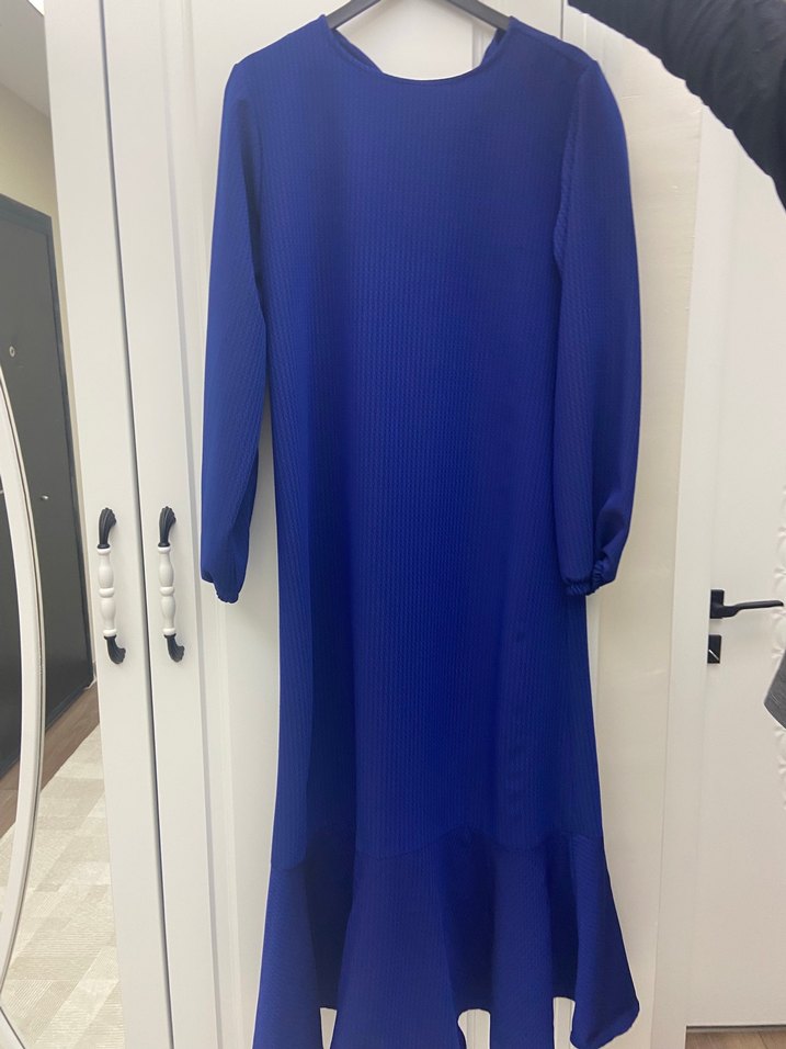 Uzun kollu, piliseli ve salaş kesimli kadın mavi elbise. Minimalist ve çağdaş tarzda, ofis kullanımı için uygun renkli ve sade tasarım.