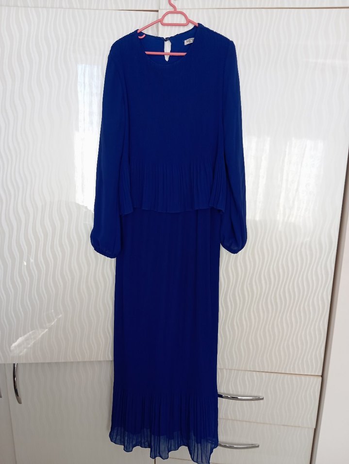 Koyu mavi renkli, uzun kollu, bisiklet yaka ve bol kesimli keten elbise. Pliseli detayları ile minimalist ve sade bir görünüm sunar, ofis için uygundur.