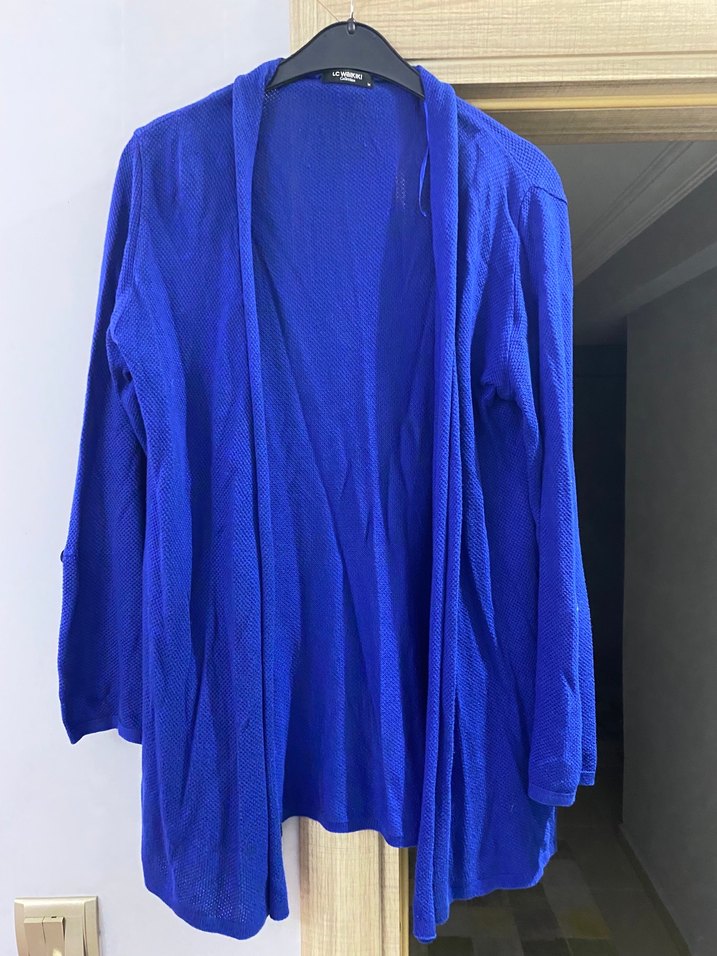 Kadınlar için koyu mavi renkte, uzun kollu, salaş kesimli ve yakası kesik yaka olan keten kumaştan yapılmış midi uzunluğunda hırka. Minimalist günlük stil için uygundur.