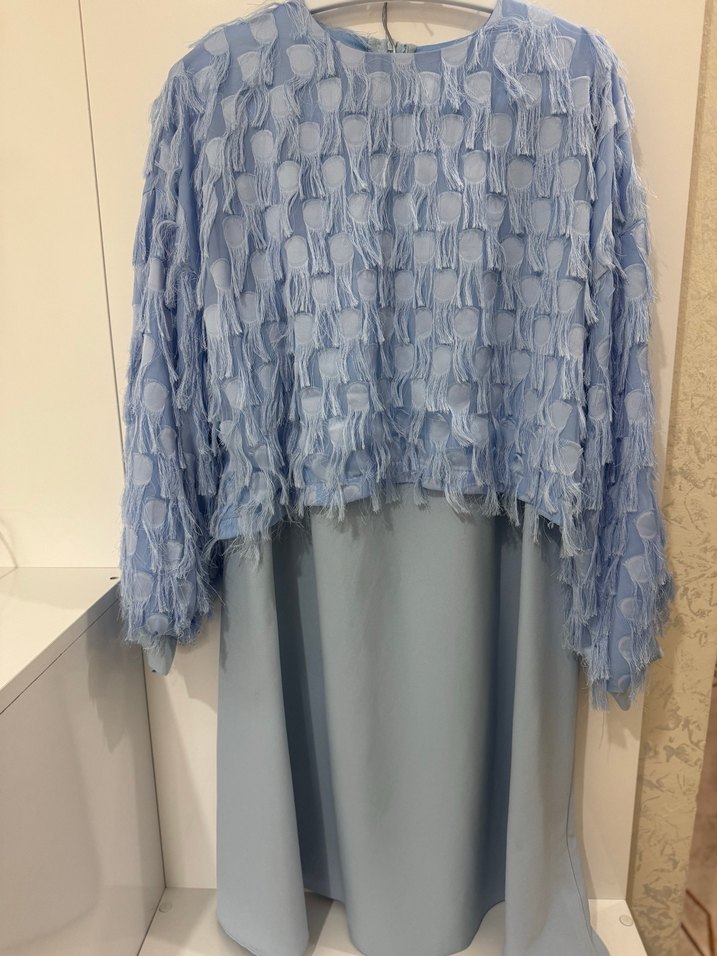 Kadın mavi uzun kollu, salaş kesim, yuvarlak yakalı tunik. Sentetik kumaştan, fırfır detaylı, pastel tonlarda batik desenli, ofis kullanımı için uygun.