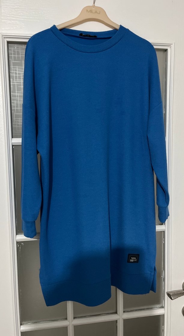 Kadınlar için uzun kollu, yuvarlak yakalı, salaş kesim mavi tunik. Yumuşak ve sıcak kumaştan üretilmiş, rahat ve şık bir sokak stili sunar.