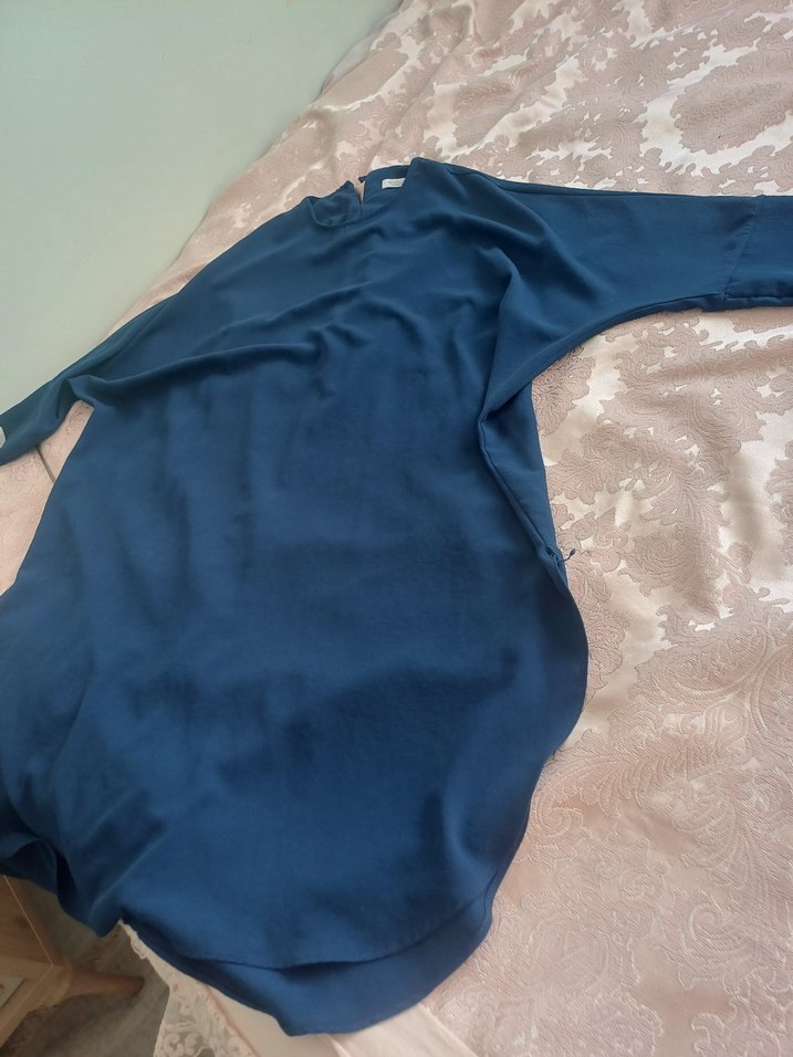 Kadınlar için drapeli, yuvarlak yakalı ve uzun kollu tunik. İpek gibi kumaştan, salaş kesim ve uzun boyda, koyu mavi renkte, günlük kullanım için uygun. hamile tuniği olarak da kullanılır eylül marka yarasa kollu