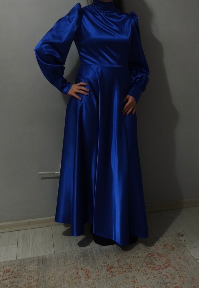 Kadınlar için parlak mavi saten kumaştan, yüksek yakalı ve uzun kollu uzun abiye elbise. Drapeli ve klasik gotik tarzda, düğünler için uygun.