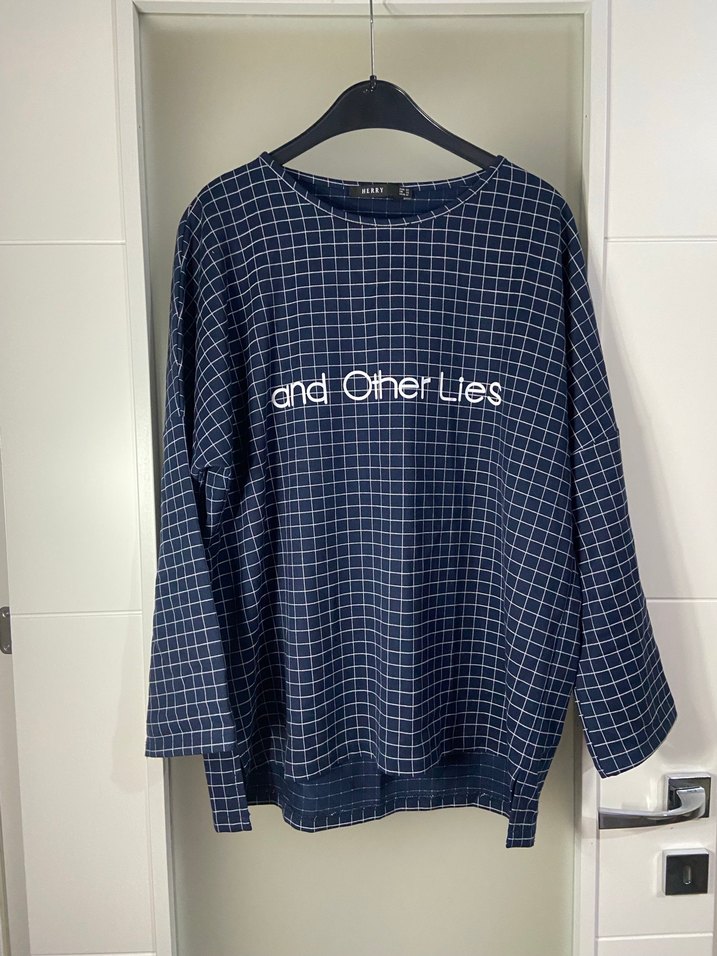 Koyu mavi, uzun kollu, bisiklet yaka ve bol kesim kadın sweatshirtü. Örgü denim kumaştan, kareli desenli ve önünde 'and Other Lies' yazısı bulunur. Günlük sokak stili için uygundur.
