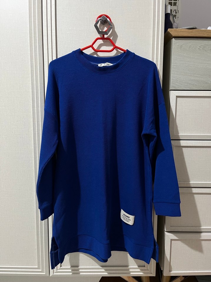 Mavi, uzun kollu, yuvarlak yaka ve bol kesime sahip, yumuşak ve sıcak kumaştan yapılmış sweatshirt. Düz ve desensiz tasarımda, küçük etiket detayı bulunur.