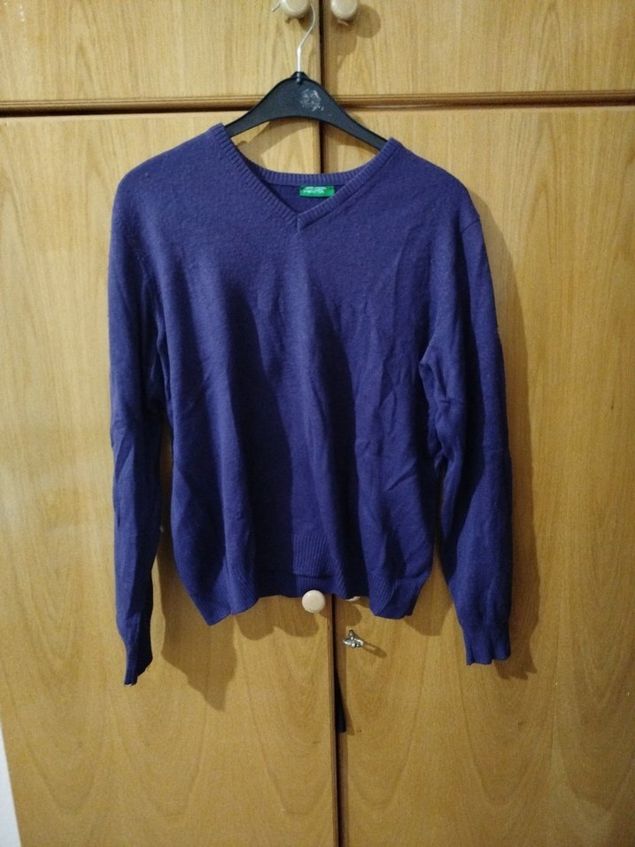 Koyu mor renkte, uzun kollu v yaka olan yumuşak yün triko kazak, rahat ve bol kesimdir. Günlük sokak stili için uygundur.