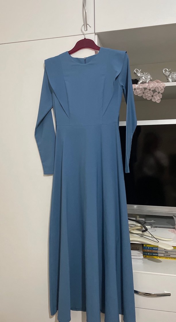 Bu uzun mavi elbise, uzun kollu ve V yakalı olup, düzgün sentetik kumaştan ve rahat kesimle üretilmiştir. Minimalist, modern klasik tarzı ofis için uygundur 36-38 bedene uygundur