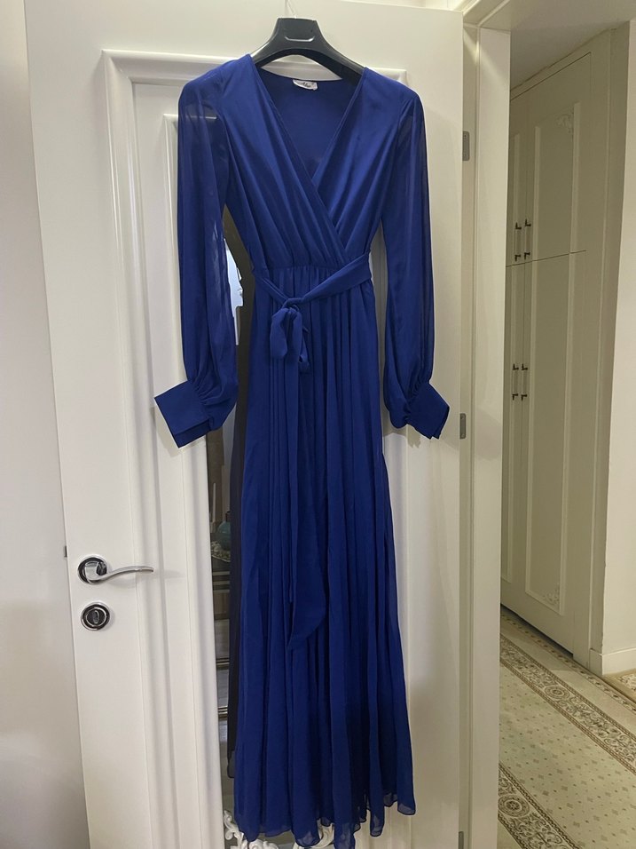 Kadın Mavi Uzun Kollu Uzun Elbise