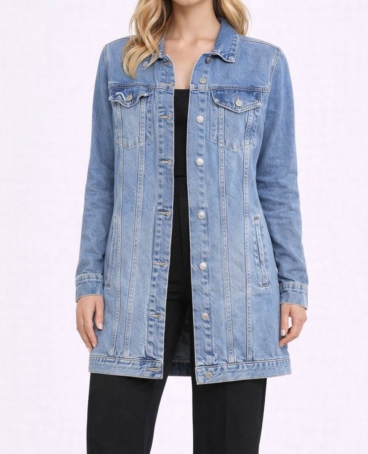 Kadınlar için açık mavi kot ceket, normal kesim ve düğmeli ön kapama ile. Notlu yaka ve uzun kollu, günlük sokak stiline uygun.