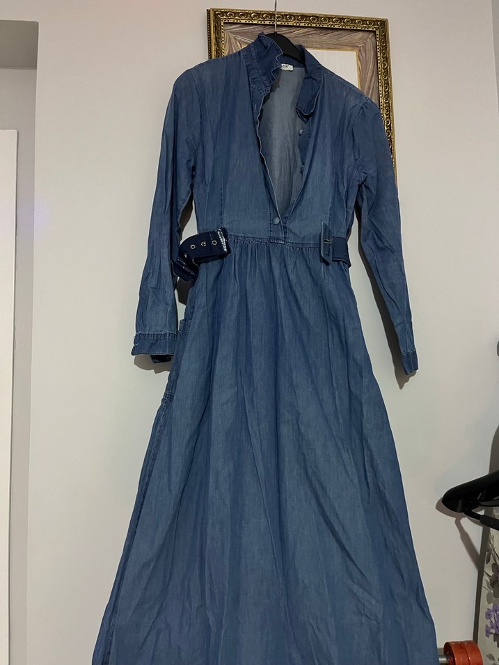 Uzun ve koyu mavi renkte kot kumaştan yapılmış, yakası kesik ve kemerli bel detayına sahip elbise. Vintage bohem tarzını yansıtan, rahat kesimli ve askılı kolludur.