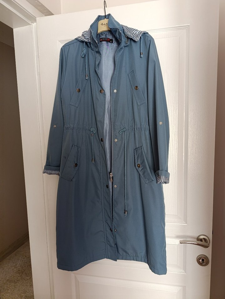 Mavi renkli, düğmeli, kapüşonlu çizgili iç detaylı uzun kot trençkot. Salaş kesim, günlük sokak stiline uygun.
